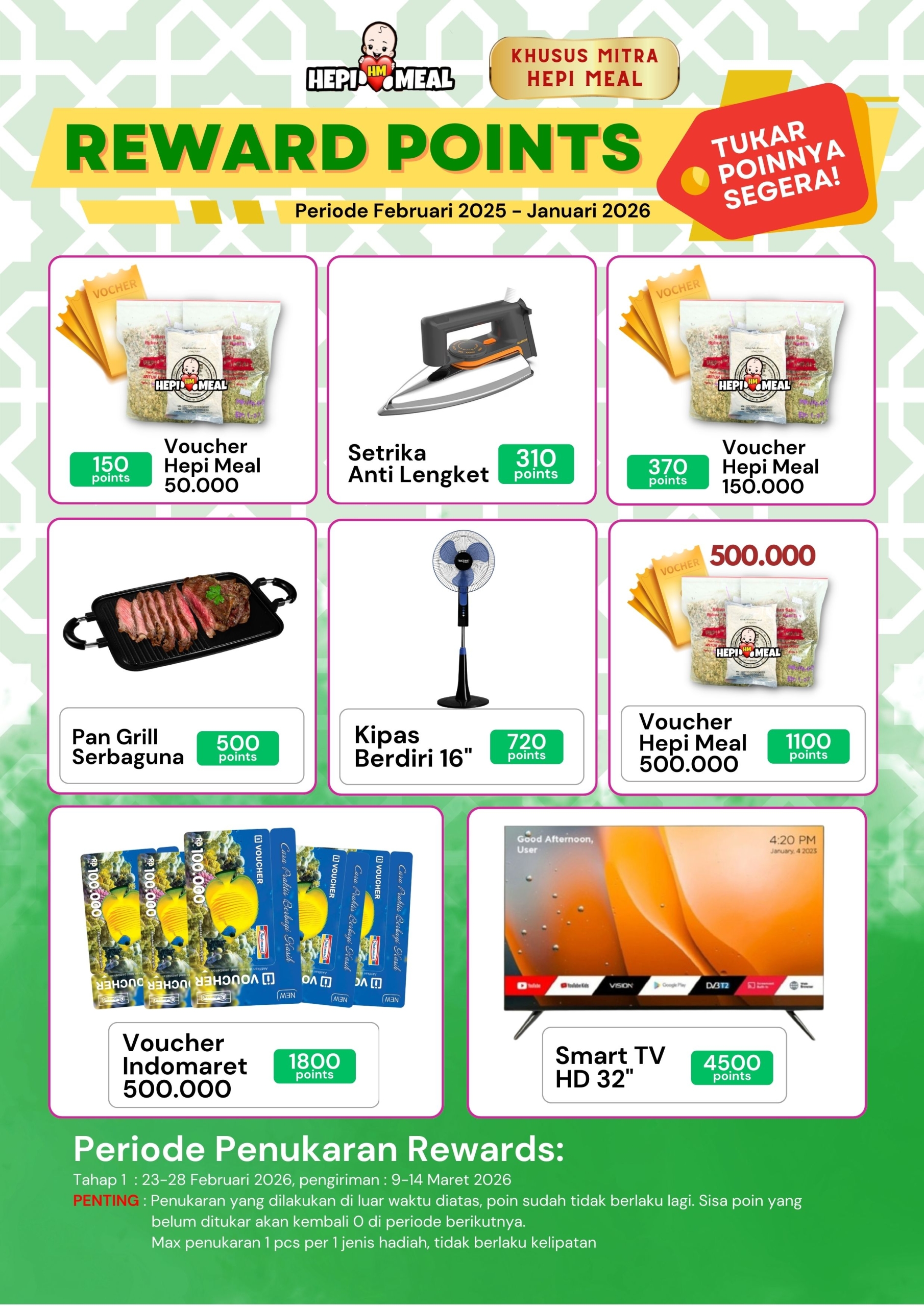 PENTING : Penukaran yang dilakukan di luar waktu diatas, poin sudah tidak berlaku lagi. Sisa poin yang belum ditukar akan kembali 0 di periode berikutnya.